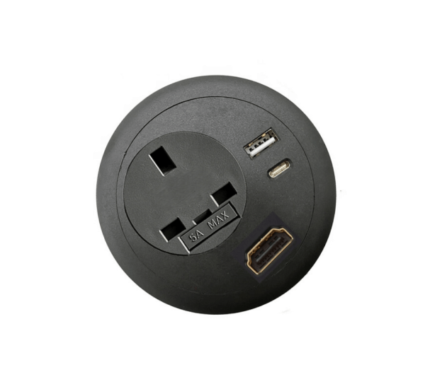 Ø80mm Grommet UK Power 5A-fused w/ USB A + C PD (I Phone), 1 x HDMI, 1.5m cable